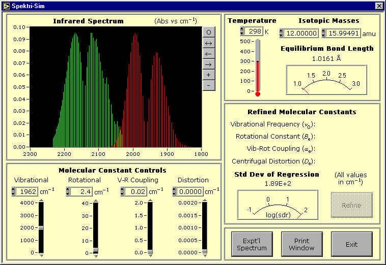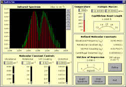 | Spektri-Sim is a Windows-based software application for simulating and analyzing the infrared spectra of diatomic molecules. It offers an alternative to the usual spreadsheet-based methods of analysis encountered by students in the physical chemistry laboratory. Spektri-Sim features a unique, visual approach for evaluating molecular constants in which the student interactively seeks the optimal fit of a simulated spectrum to the experimental spectrum. Using Spektri-Sim, students consider the influence that the molecular constants and temperature have on the features of the infrared spectrum. |